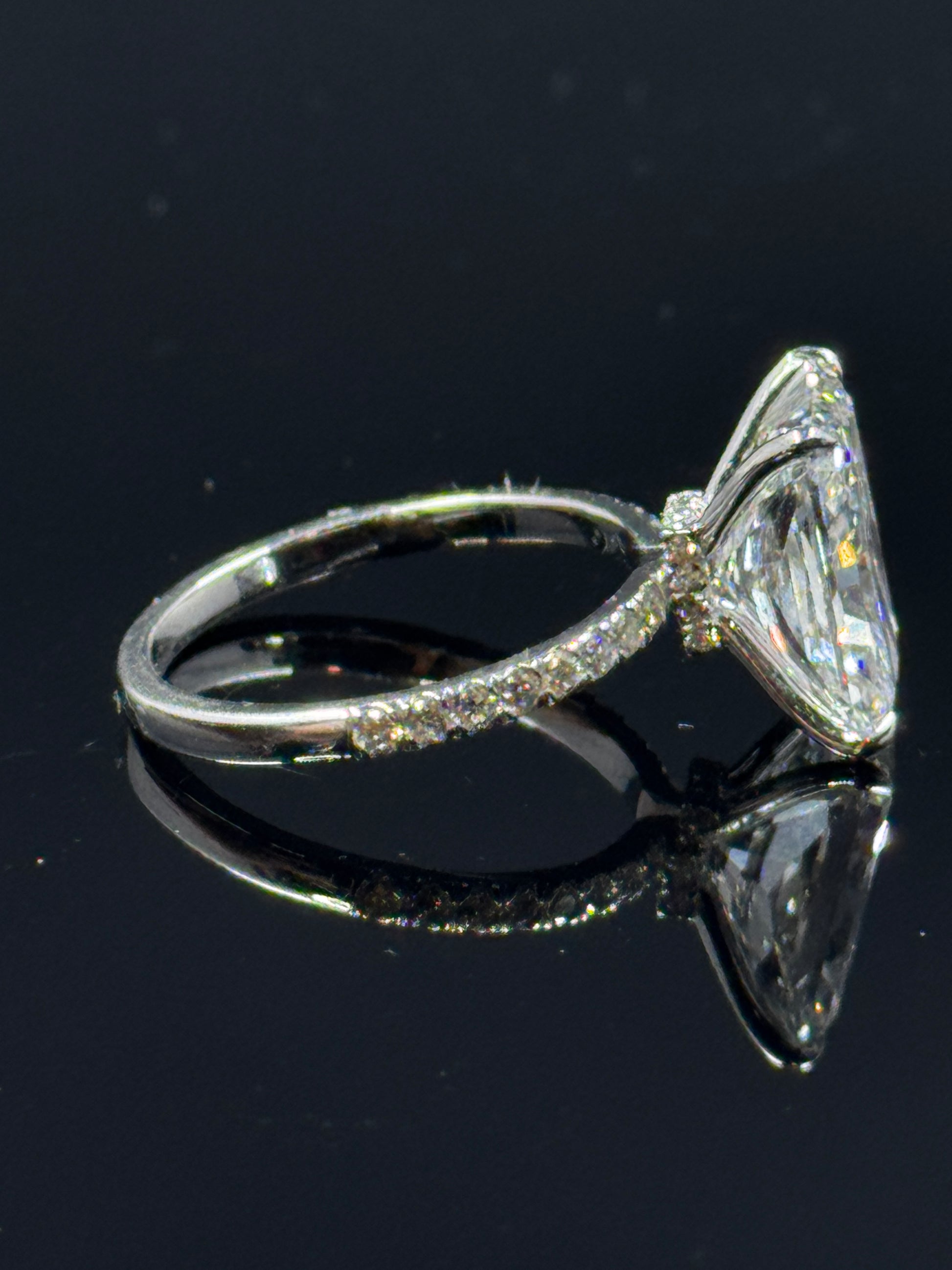 The centerpiece is a certified 5.08ct radiant-cut lab-grown diamond, graded F VS1 with Excellent polish, Excellent symmetry, and None fluorescence (IGI #651494990). The hidden halo and diamond accents on the shank create a radiant effect from every angle.