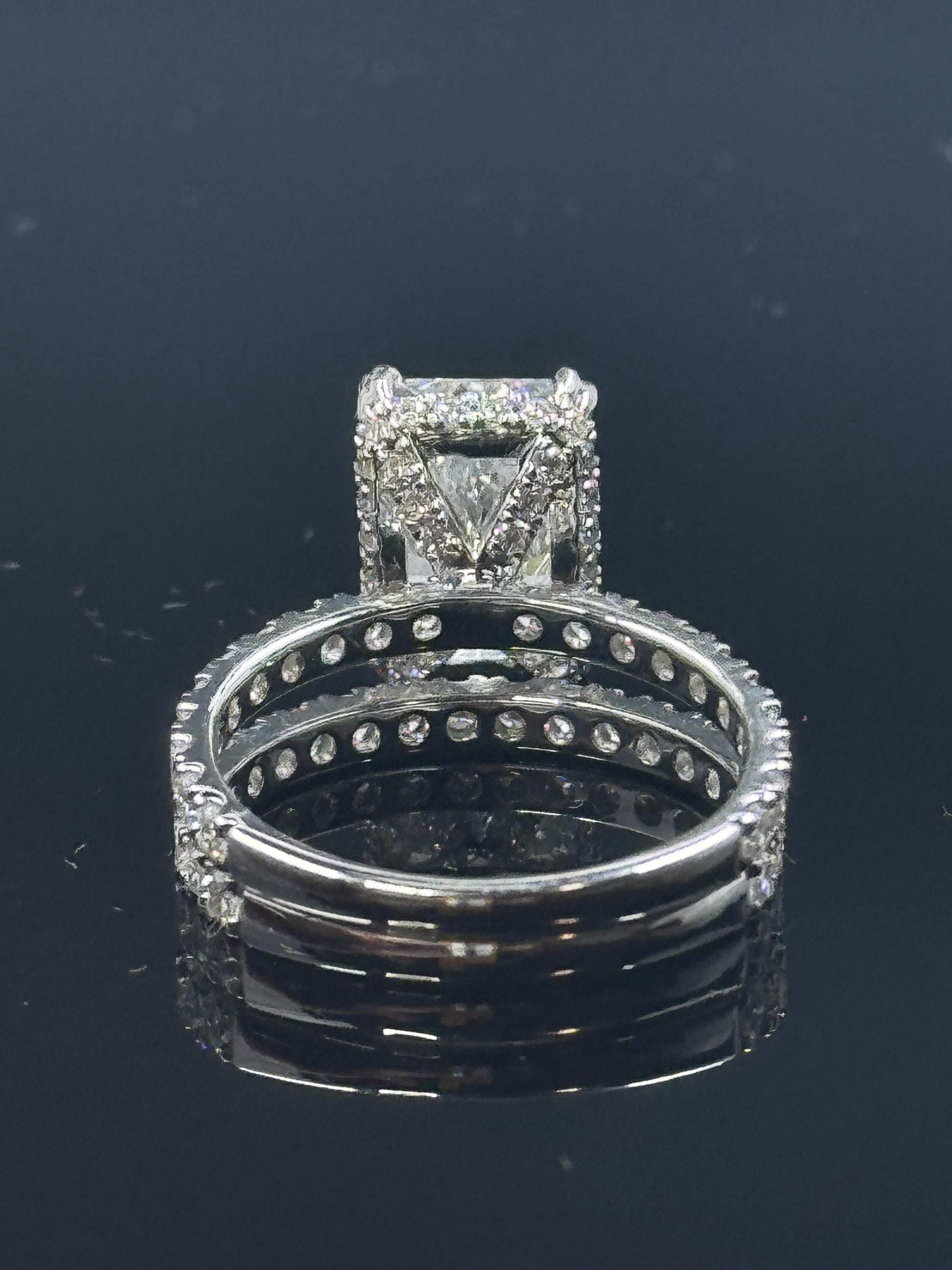 A true showstopper — this radiant-cut diamond bridal set pairs a dazzling engagement ring with a perfectly matched eternity band, crafted in solid 14k white gold (4.88g). Designed for maximum brilliance, this set combines elegance with bold sparkle.