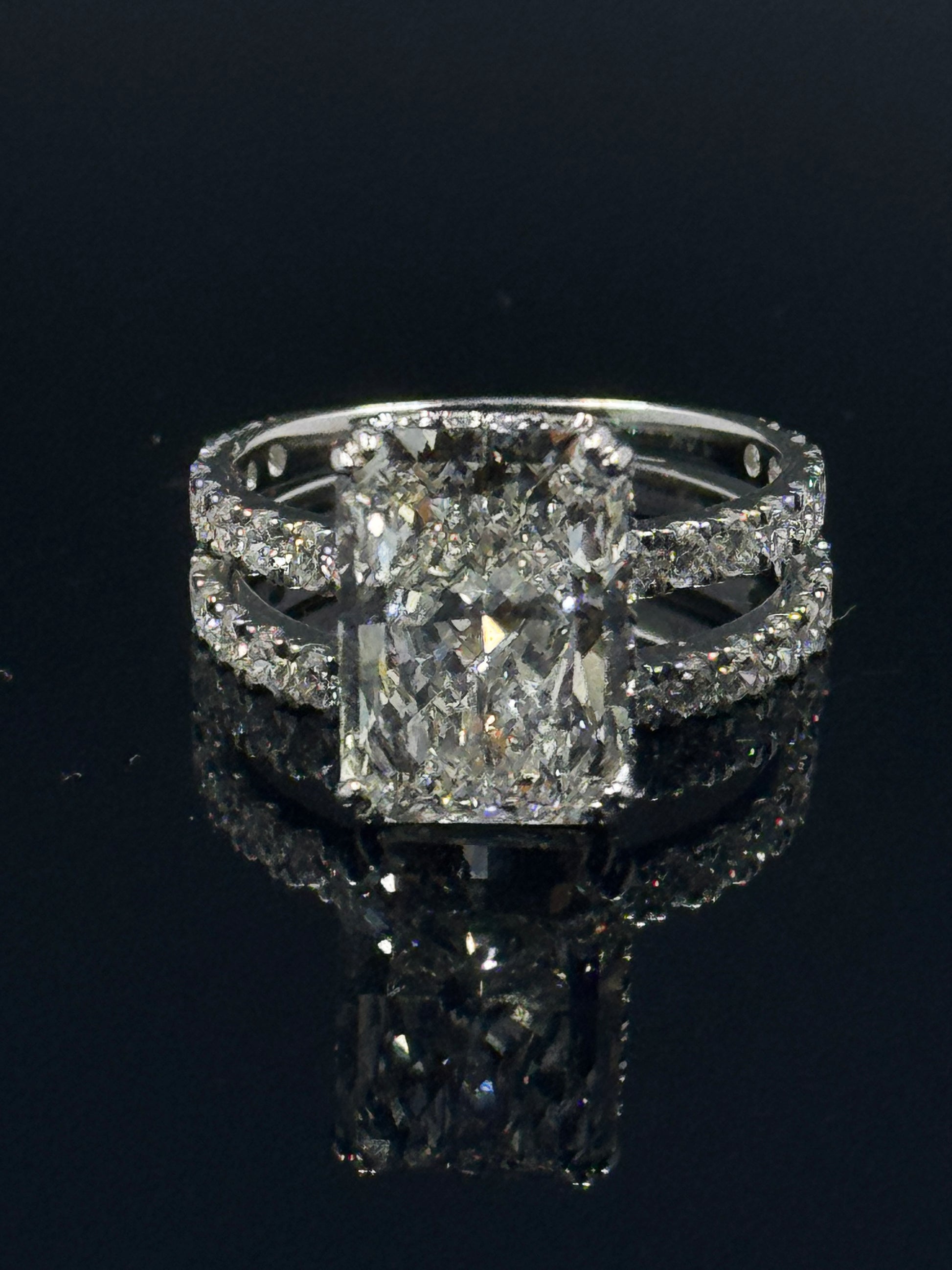 - Center Stone: 4.93ct Radiant-Cut Lab-Grown Diamond (E VVS2, EX/EX, None)