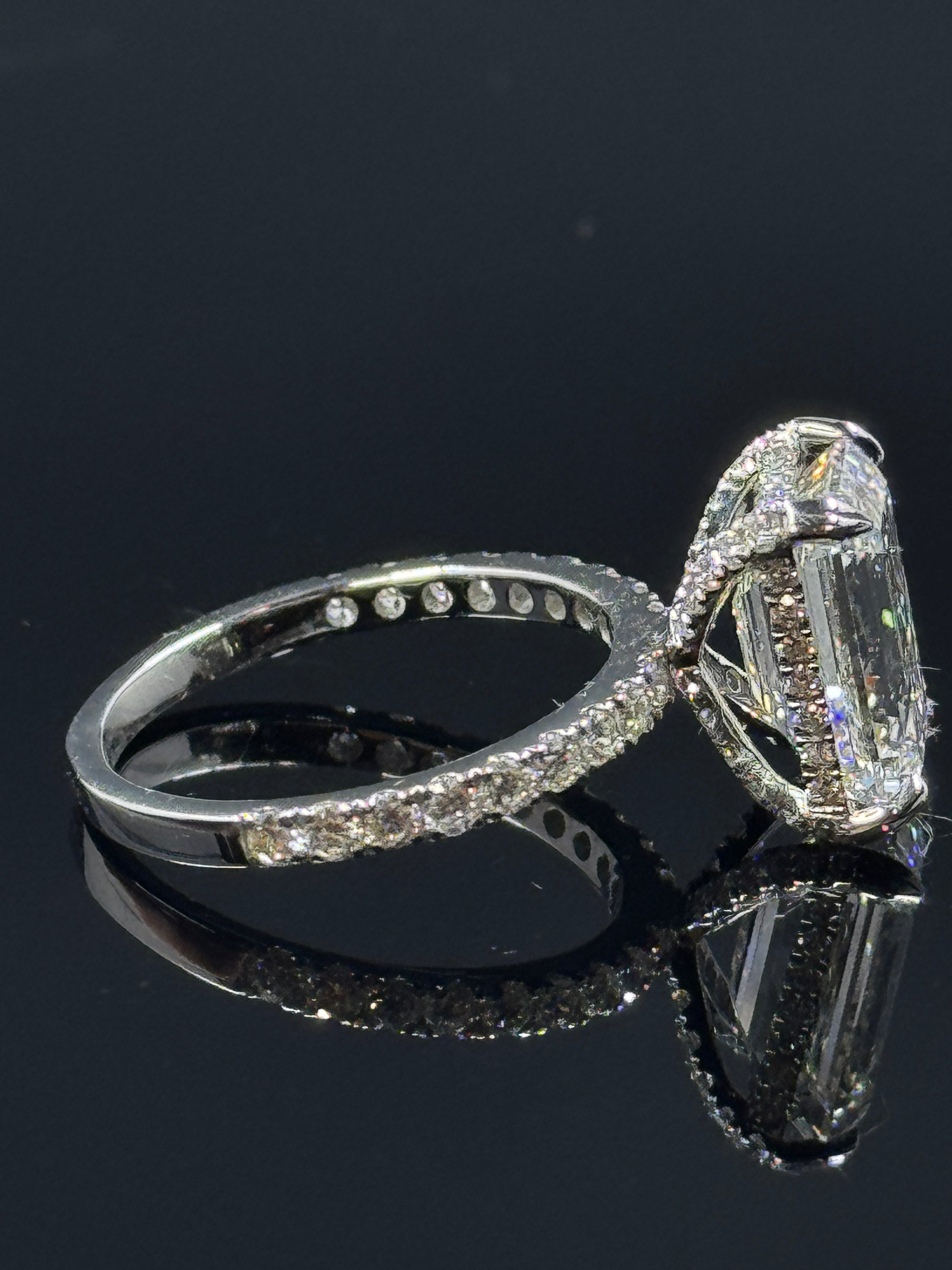 The centerpiece is a certified 4.86ct emerald-cut lab-grown diamond, graded E VVS2 with Excellent polish, Excellent symmetry, and None fluorescence (IGI #680589412). Accented with 1.30ctw of side stones, the total weight of this ring reaches an impressive 6.16ctw.