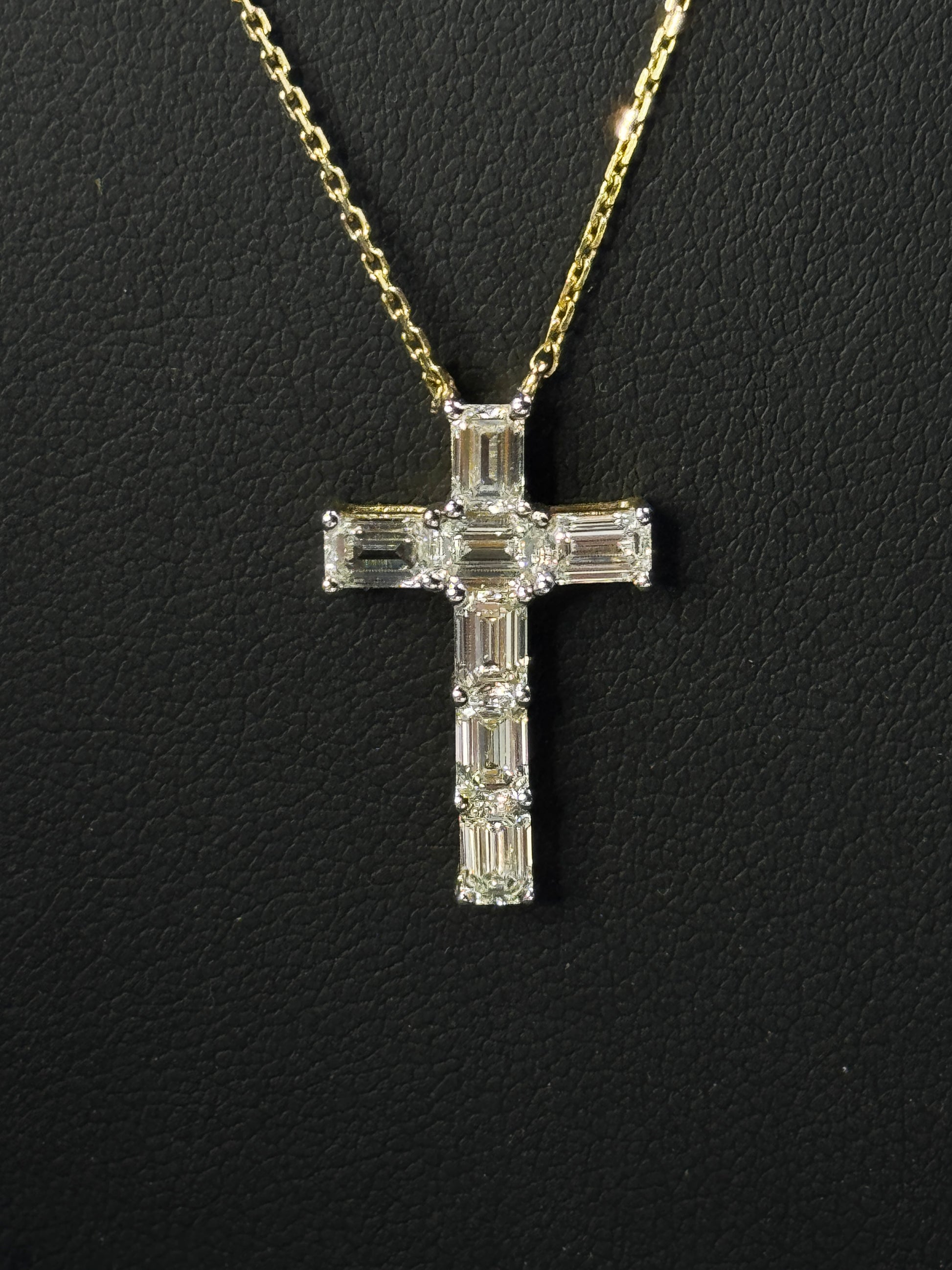 A radiant symbol of faith — this diamond cross necklace is crafted in 14k yellow gold and set with 1.75 carats of bright, VS1 lab-grown diamonds. The 1-inch cross pendant is suspended from an 18-inch chain, offering timeless brilliance with a warm golden glow.